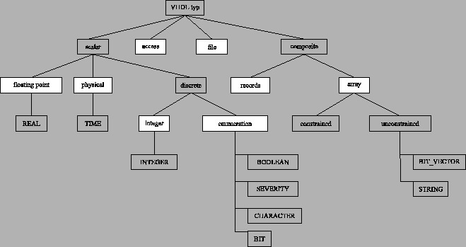 For each data object a instance from a appropriate type calls is created. The type class is derived from the corresponding type base class which exists for each VHDL type group (integer, enumeration, floating point, physical, record, array, access, and file). These base classes include all data which are necessary to store the actual data value. The derived type class implements operators and methods to perform range checking and type conversion. Note, all type classes belonging to the same VHDL type group are derived from the same type base class. Hence, assignments i.e. between different VHDL integer types are allowed on C++ level even though they are prohibited by the VHDL standard. It is the task of the VHDL compiler to reject such illegal VHDL operations before code generation starts.